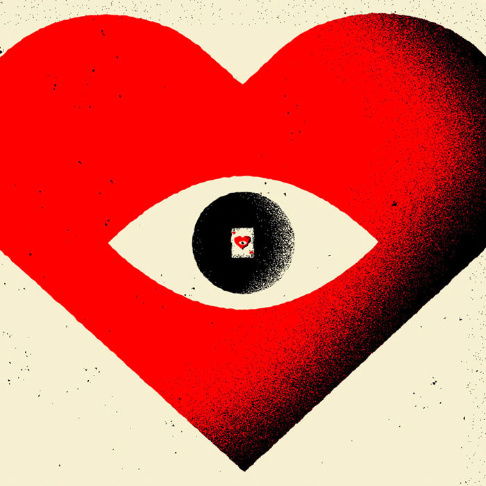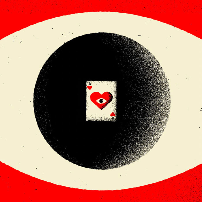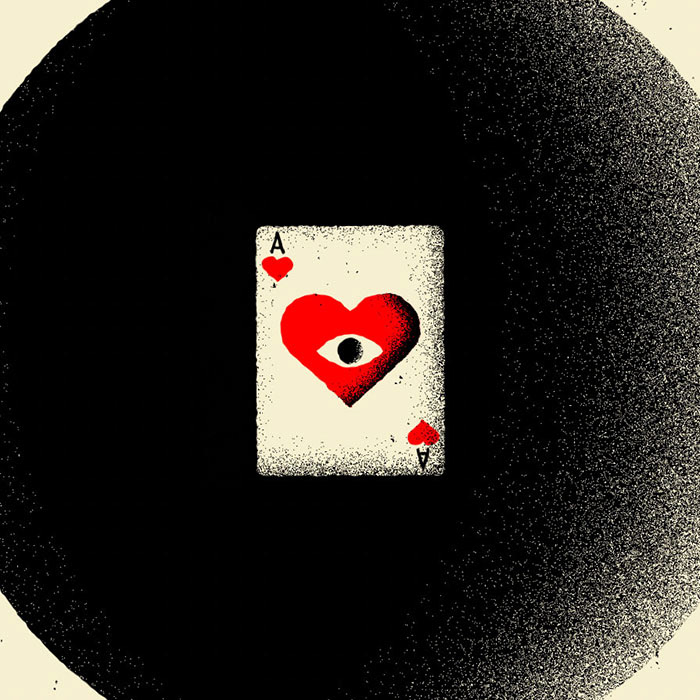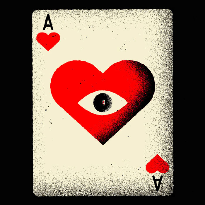 Drawn in Adobe Illustrator, my Ace of Hearts artwork was imported into After Effects, where wiggle expressions to both position and rotation were added on the null layer that controls the movement. Icing on the cake, an adjustment layer with a turbulent displace effect roughens those previously smooth Adobe Illustrator edges. - Joe Gast