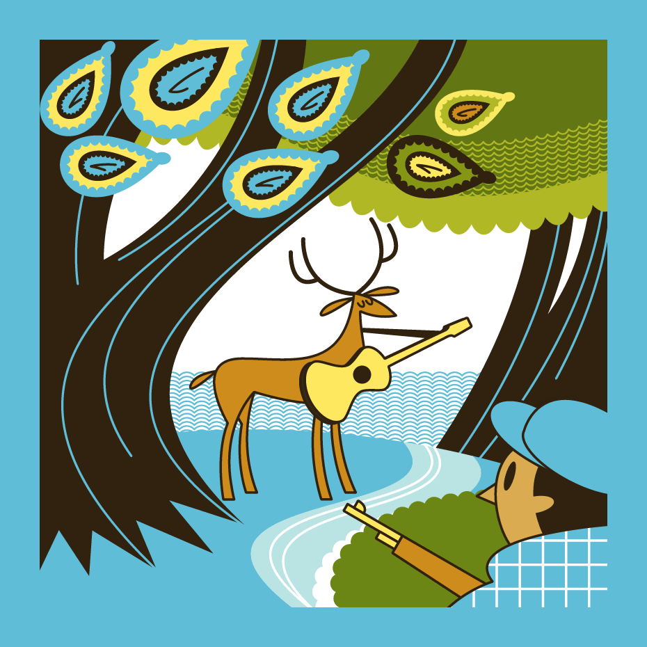 With paisley leaves, a bouncy butterfly and a guitar playing deer, this image has a playful pop sensibility. Drawn in